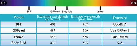 BFP,GFPemd(Emerald) and DsRed are commonly used in research and thus were used in this study. In addition, body fluids such as urine and semen are also included in this study for wider applications in related fields. Key spectrum properties of these fluorescent proteins are listed in (Table 1)